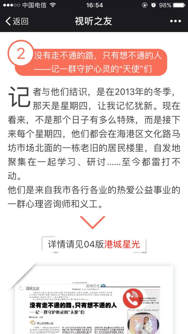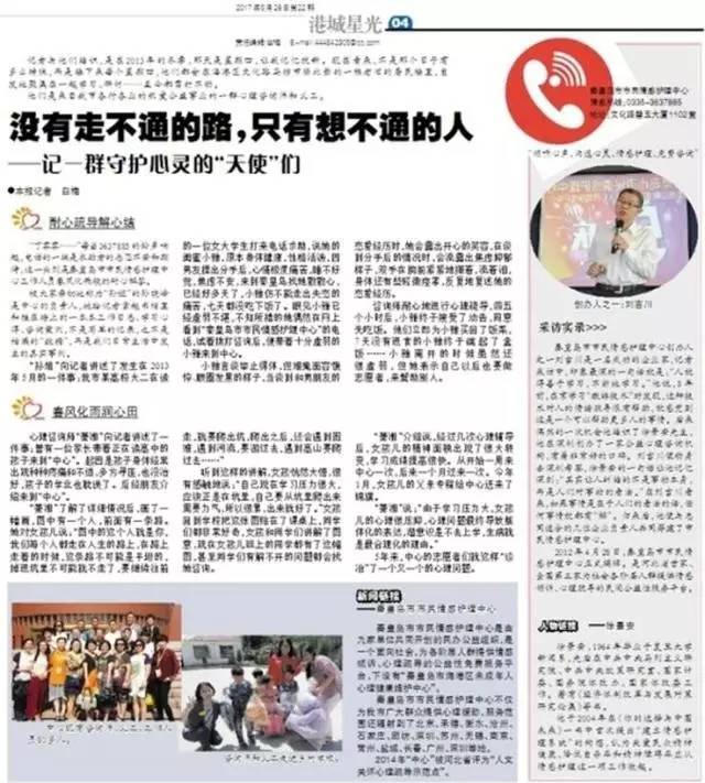 2017年5月26日,第22期《視聽之友》第四版“港城星光”欄目記者白梅的一篇《沒(méi)有走不通的路,只有想不通的人》,再次報(bào)道了秦皇島市市民情感護(hù)理中心的事跡和由來(lái)。