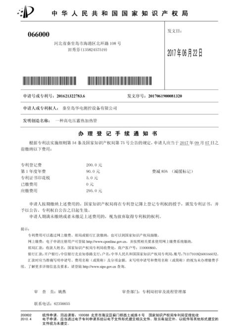 【企業(yè)要聞】喜訊:公司申請(qǐng)的“一種高電壓蓄熱加熱管”專(zhuān)利授權(quán)