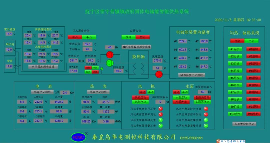 2020年11月5日,秦皇島華電測(cè)控科技有限公司保質(zhì)保量地完成了秦皇島市某鎮(zhèn)政府供熱系統(tǒng)改造工作,并于11月5日開(kāi)啟了供暖工作。本次改造工作,將原有的燃油鍋爐改造成智能電儲(chǔ)能供熱系統(tǒng),實(shí)現(xiàn)環(huán)保取暖與智能控制等多重效果。