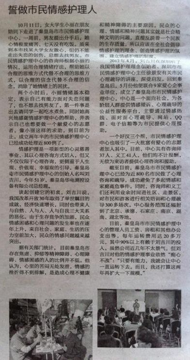 摘自《秦皇島晚報(bào)》(2014年10月15日,B15版):情感護(hù)理是一項(xiàng)新型的心靈慈善事業(yè),其以心理咨詢(xún)方式切入,但又不僅僅限于心理咨詢(xún),更側(cè)重于人生觀、價(jià)值觀、幸福觀的引導(dǎo)。秦皇島市市民情感護(hù)理中心的創(chuàng)始人名叫劉吉川,今年51歲,秦皇島華電測(cè)控設(shè)備有限公司總經(jīng)理。