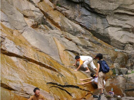 進(jìn)入景區(qū),迎面就是景區(qū)管理站天泉山莊,山莊往前走就是一片原生態(tài)的天然美景,幽谷峰秀,天青水白,怪石流水。大家三五成群的結(jié)伴在山谷里前行,就像是行走在畫(huà)里一樣。道路兩旁是溪水和灌木,孩子們時(shí)不時(shí)蹲下用手去撩撥水里的小魚(yú),大人們則一邊欣賞山色美景,一邊為孩子們照相留影。人們就這樣行走在湖光山色之間,大家一路游覽了古廟、仙人石、瀑布水潭等景觀。時(shí)間不知不覺(jué)的在人們愉快的交談和孩子們的嬉戲打鬧中過(guò)去了。臨近午后,大家三五成群的回到天泉山莊,并在那里午飯休息。男士吃飯喝酒氣氛熱烈,女士嘮家常、品服飾悠閑愜意。孩子們玩耍嬉戲樂(lè)而忘返。
