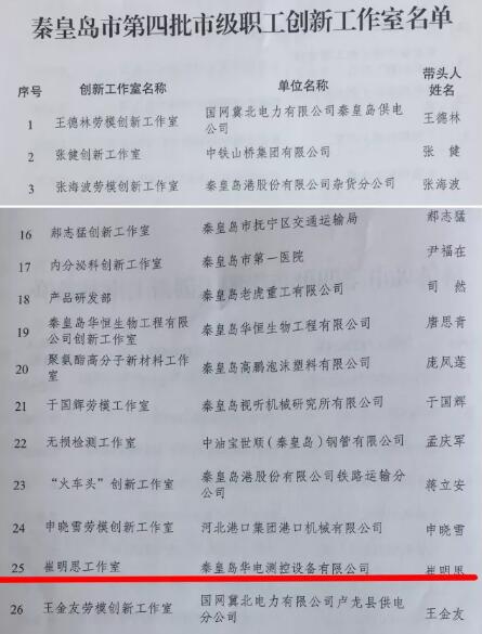 秦皇島華電測控設(shè)備有限公司“崔明思工作室”被秦皇島市勞動競賽委員會命名為第四批市級職工創(chuàng)新工作室。