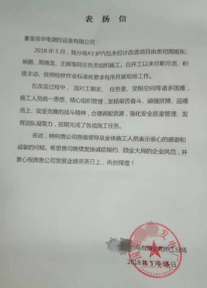 2018年5月18日,公司再次收到來(lái)自國(guó)電某發(fā)電廠的一封表?yè)P(yáng)信。信中,甲方對(duì)公司全體施工人員盡職盡責(zé)、積極主動(dòng)、規(guī)范有序的態(tài)度和精神提出嘉許。信中提到:“在改造過(guò)程中,面對(duì)工期緊、任務(wù)重、受限空間等諸多因素,施工人員統(tǒng)一思想、精心組織管理,發(fā)揚(yáng)艱苦奮斗、頑強(qiáng)拼搏、迎難而上、攻堅(jiān)克難的戰(zhàn)斗精神,合理調(diào)配資源,強(qiáng)化安全質(zhì)量管理、發(fā)揮團(tuán)隊(duì)凝聚力,按期完成了各項(xiàng)施工任務(wù)。”