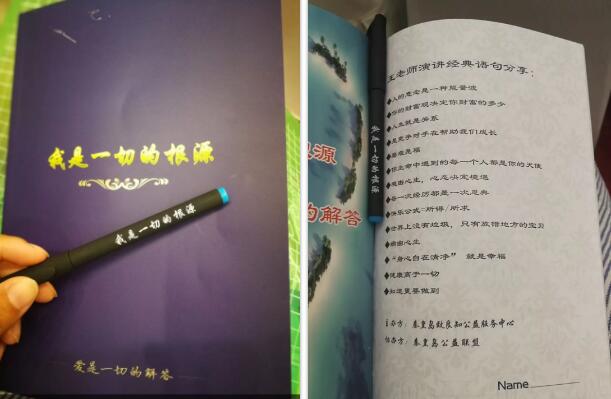 學(xué)習(xí)中,每個人手握著筆,告訴你“我是一切的根源”;手里拿著的筆記本,告訴你“我是一切的根源”;耳朵聽到的是“我是一切的根源”;眼睛看到的是“我是一切的根源”。讓整個人從觸摸到看到聽,身心合一地去感悟“我是一切的根源”。