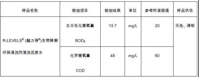 融力得®生物降解環(huán)保清洗劑經(jīng)英格爾檢測技術服務(上海)有限公司檢驗,生化需氧量為13.7 mg/L,遠遠高于中國國家環(huán)保標準要求,可以通過工廠現(xiàn)有污水處理系統(tǒng)進行排放。