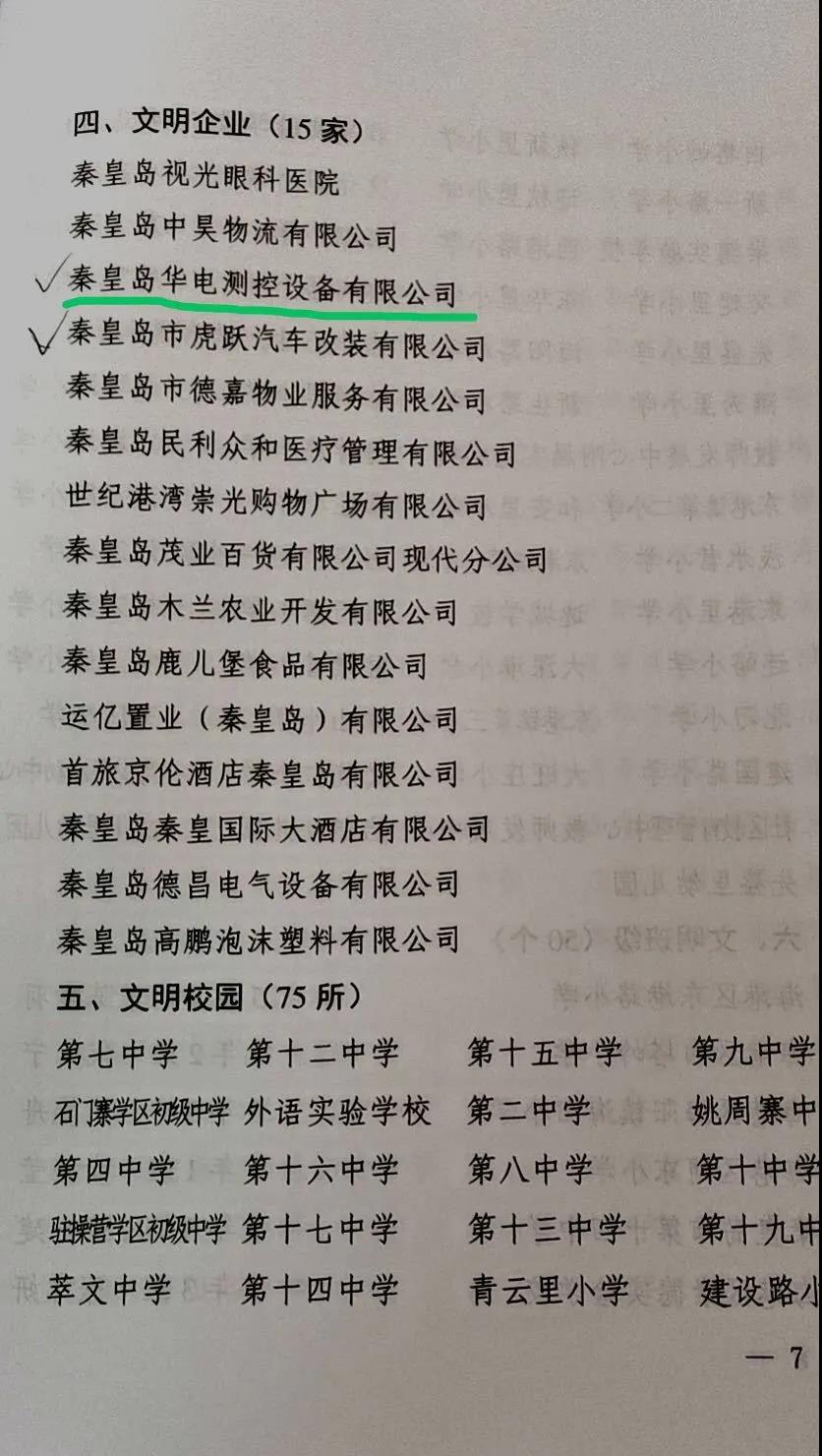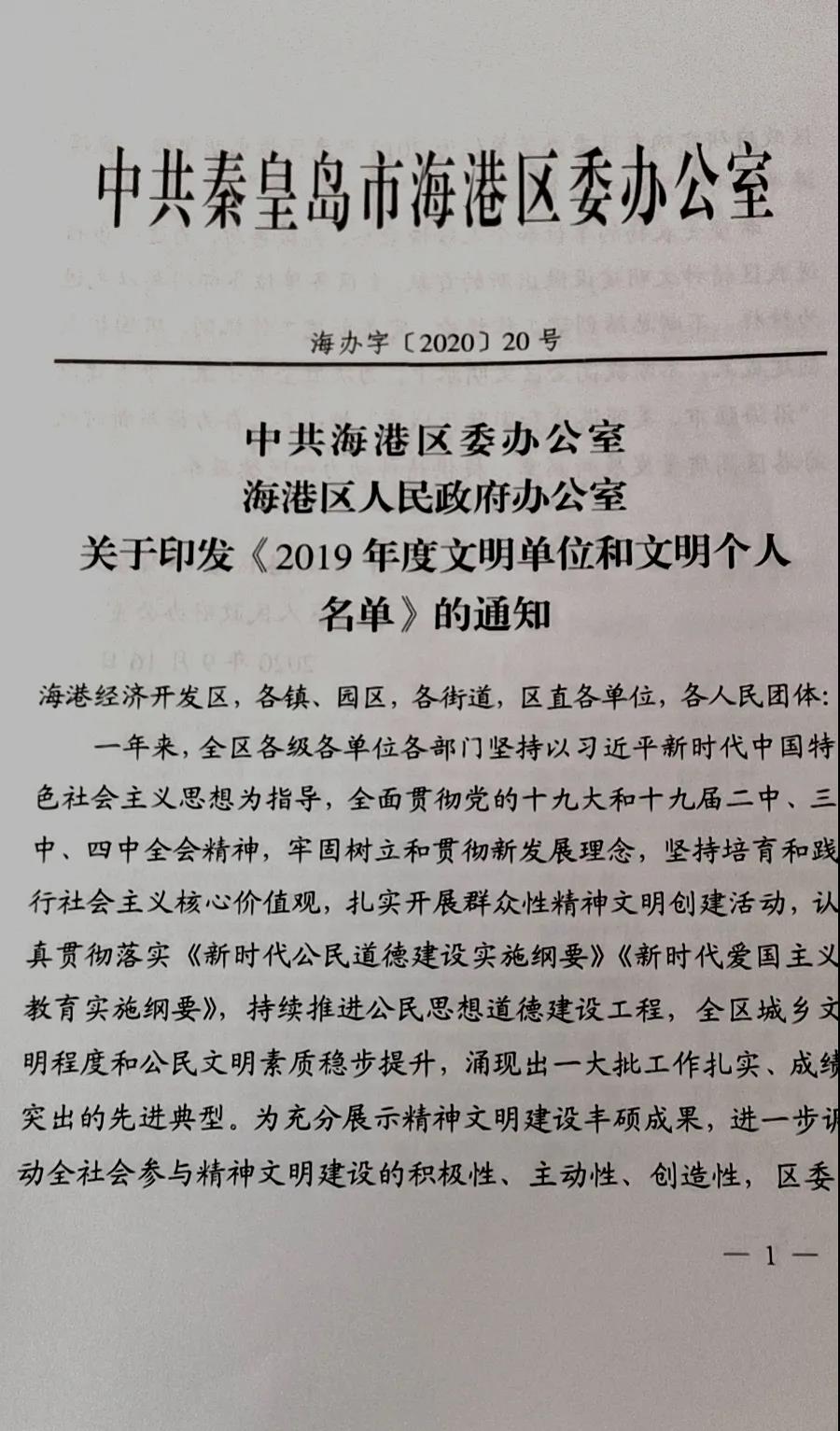 2020年4月,中共秦皇島市海港區(qū)委、區(qū)政府組織申報2019年度文明單位和文明個人,經(jīng)過推薦評審,近日獲悉華電測控榮獲文明單位稱號。