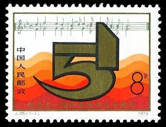 先介紹第一枚郵票,那是中國人民郵政在1979年5月1日發(fā)行的《紀(jì)念“五一”國際勞動(dòng)節(jié)九十周年》紀(jì)念郵票。該套郵票志號(hào):J.35,全套郵票1枚,面值:8分,票名:鐮刀和鐵錘,設(shè)計(jì)者:鄧錫清。
