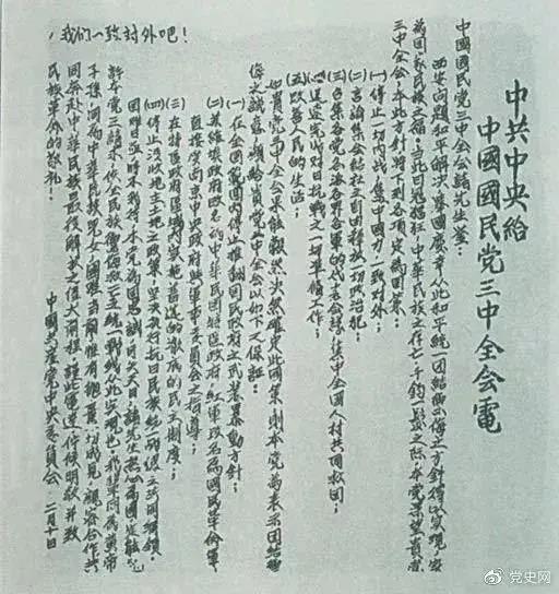 1937年2月10日,中共中央致電國民黨五屆三中全會(huì),提出五項(xiàng)要求:停止內(nèi)戰(zhàn),一致對外;保障言論、集會(huì)、結(jié)社的自由,釋放一切政治犯;召開各黨各派各界各軍的代表會(huì)議,集中全國人才,共同救國;迅速完成對日作戰(zhàn)的一切準(zhǔn)備工作;改善人民生活。電文指出,如果國民黨將上述五項(xiàng)要求定為國策,中國共產(chǎn)黨愿實(shí)行如下四項(xiàng)保證:停止武力推翻國民黨政府的方針;工農(nóng)政府改名為中華民國特區(qū)政府,紅軍改名為國民革命軍;特區(qū)實(shí)行徹底民主制度;停止沒收地主土地的政策,堅(jiān)決執(zhí)行抗日統(tǒng)一戰(zhàn)線的共同綱領(lǐng)。15日,在國民黨的五屆三中全會(huì)上,宋慶齡、何香凝、馮玉祥等為響應(yīng)中國共產(chǎn)黨關(guān)于國共合作,聯(lián)合抗日的建議,提出關(guān)于恢復(fù)孫中山所制定的聯(lián)俄、聯(lián)共、扶助農(nóng)工三大政策緊急議案。