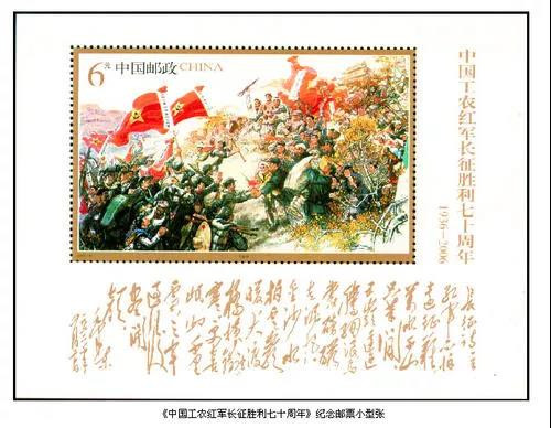 國(guó)家郵政局于2006年10月22日發(fā)行了《中國(guó)工農(nóng)紅軍長(zhǎng)征勝利七十周年》紀(jì)念郵票1套4枚,小型張1枚。志號(hào):2006-25。全套面值:3.20元。設(shè) 計(jì) 者:郝旭東。