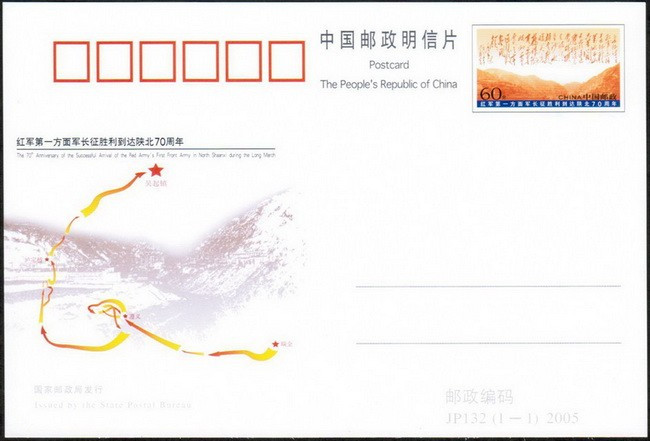 2005年10月19日,在紅一方面軍到達(dá)陜北吳起鎮(zhèn)70周年紀(jì)念日到來之際,國(guó)家郵政局曾發(fā)行JP132《紅軍第一方面軍長(zhǎng)征勝利到達(dá)陜北70周年》紀(jì)念郵資明信片1套1枚,郵資片的郵資圖案為毛澤東的《七律?長(zhǎng)征》詩(shī),郵資片主圖為紅一方面軍長(zhǎng)征路線簡(jiǎn)圖,路線圖起點(diǎn)是瑞金,終點(diǎn)為陜北吳起鎮(zhèn)。這枚紀(jì)念郵資明信片的發(fā)行,從側(cè)面證實(shí)了長(zhǎng)征題材第一套郵票,紀(jì)念的是紅一方面軍勝利完成二萬五千里長(zhǎng)征二十周年。
