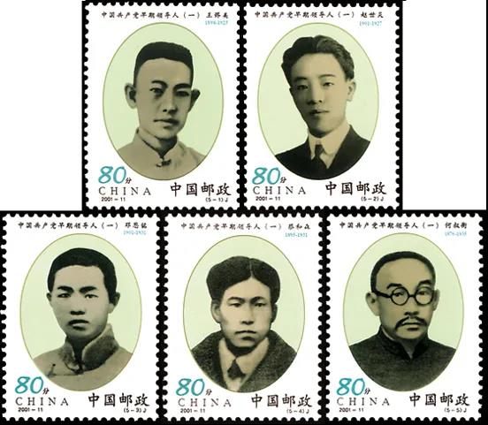 中國共產(chǎn)黨早期組織的創(chuàng)建者和早期領(lǐng)導(dǎo)人王盡美、趙世炎、鄧恩銘、蔡和森、何叔衡,就是這些千千萬萬個(gè)共產(chǎn)黨員中的杰出代表。為深切緬懷這些革命先驅(qū)者的光輝業(yè)績(jī),學(xué)習(xí)繼承和發(fā)揚(yáng)他們的崇高精神,國家郵政局特于2001年6月28日發(fā)行了《中國共產(chǎn)黨早期領(lǐng)導(dǎo)人(一)》郵票一套5枚。