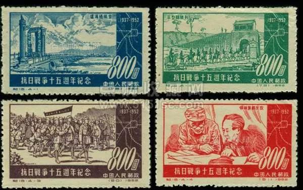 第一枚,盧溝橋風云。1952年7月7日發(fā)行了首枚《抗日戰(zhàn)爭十五周年紀念》郵票,這是新中國第一枚反映抗戰(zhàn)的郵票。這枚膠版郵票長37毫米,寬21毫米,面值為人民幣舊幣800元。孫傳哲設計,主圖為盧溝橋全景,盧溝橋的上空風起云涌,象征著日寇全面侵華戰(zhàn)爭的來臨,橋身兩側護欄望柱的小石獅來整有序地并行排列,好像守衛(wèi)山河的忠誠戰(zhàn)士,橋身下靜靜流淌的永定河水,寓意著中國人民面對災難時的從容鎮(zhèn)定,遠處連綿起伏巍然屹立的太行群峰,宛如全民族筑起抗戰(zhàn)的鋼鐵長城。