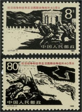 第三枚,七七戰(zhàn)火。1995年9月3日發(fā)行了《抗日戰(zhàn)爭及世界反法西斯戰(zhàn)爭勝利50周年》紀念郵票的首枚,這枚影寫版郵票長40毫米,寬30毫米,面值10分,何潔、陳楠、馮小紅聯(lián)合設計。郵票主圖以黑白照片資料取舍加工,以靜態(tài)為主,定格了中國守軍的盧溝橋頭嚴陣以待、抗擊日寇的歷史場面。