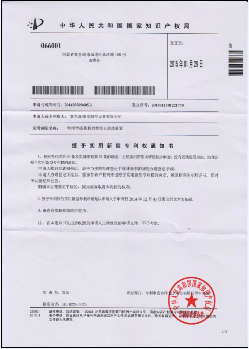 公司于2014年12月03日提交的“一種球型攝像機(jī)的智能自清洗裝置”專利已被中華人民共和國(guó)國(guó)家知識(shí)產(chǎn)權(quán)局授權(quán)實(shí)用新型專利權(quán)。