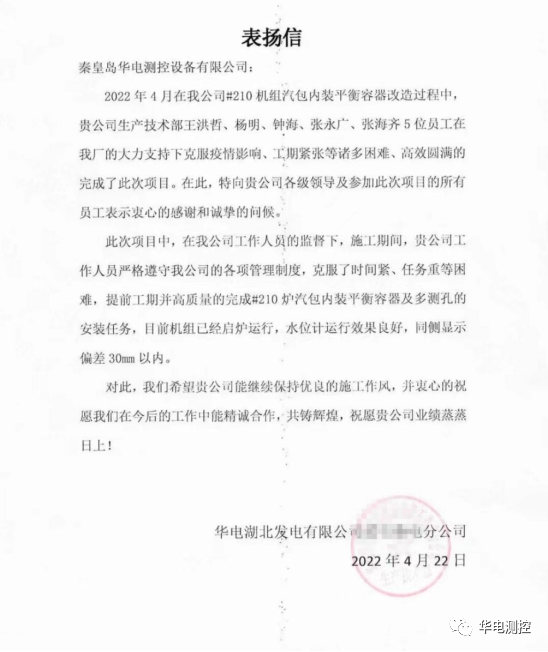 在改造過(guò)程中,我公司生技部工程技術(shù)人員王洪哲、楊明、鐘海、張永廣、張海齊等5位員工在電廠的大力支持下克服疫情影響、工期緊張等諸多困難,嚴(yán)格遵守電廠各項(xiàng)管理制度,高效圓滿地完成了此次項(xiàng)目,得到廠內(nèi)領(lǐng)導(dǎo)的一致好評(píng),并發(fā)來(lái)表?yè)P(yáng)信。