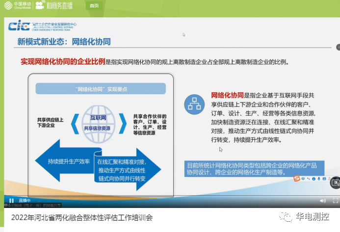 此次培訓(xùn)會(huì)議由河北省電子信息技術(shù)研究所工業(yè)大數(shù)據(jù)技術(shù)中心主任康鵬主持,采用線上直播方式。首先,河北省工業(yè)和信息廳兩化融合處鮑漪瀾老師介紹了2022年全省兩化融合評估工作整體工作安排,解析了企業(yè)兩化融合的內(nèi)涵、要素和關(guān)鍵環(huán)節(jié)。
