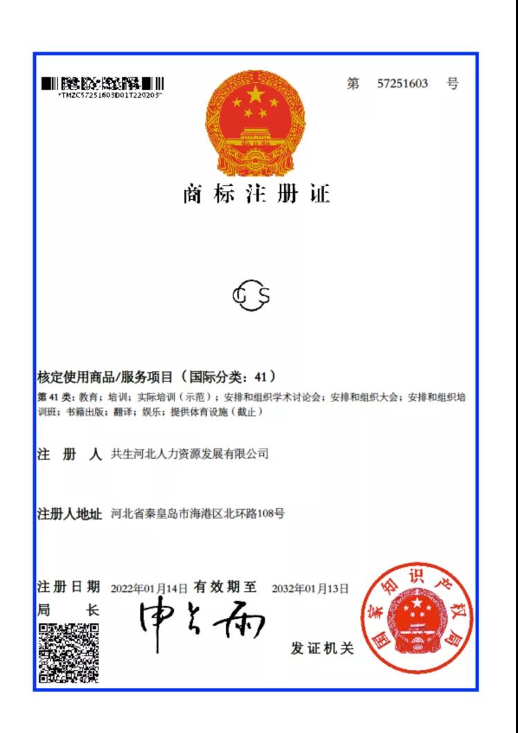 近日,共生河北人力資源發(fā)展有限公司提交的logo被中華人民共和國(guó)國(guó)家知識(shí)產(chǎn)權(quán)局頒發(fā)商標(biāo)注冊(cè)證,注冊(cè)日:2022年1月14日,授權(quán)公告號(hào):第57251603號(hào)。