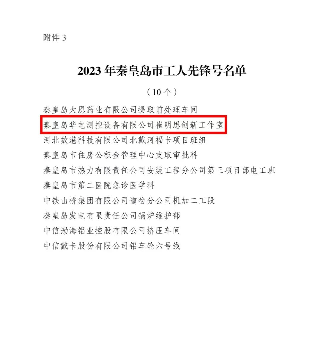 日前,秦皇島市總工會《關(guān)于授予2023年秦皇島市五一勞動獎和秦皇島市工人先鋒號的決定》(秦工字﹝2023﹞36 號)文件知悉,秦皇島華電測控設(shè)備有限公司“崔明思創(chuàng)新工作室”榜上有名,被秦皇島市總工會授予2023年秦皇島市工人先鋒號。