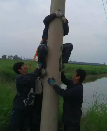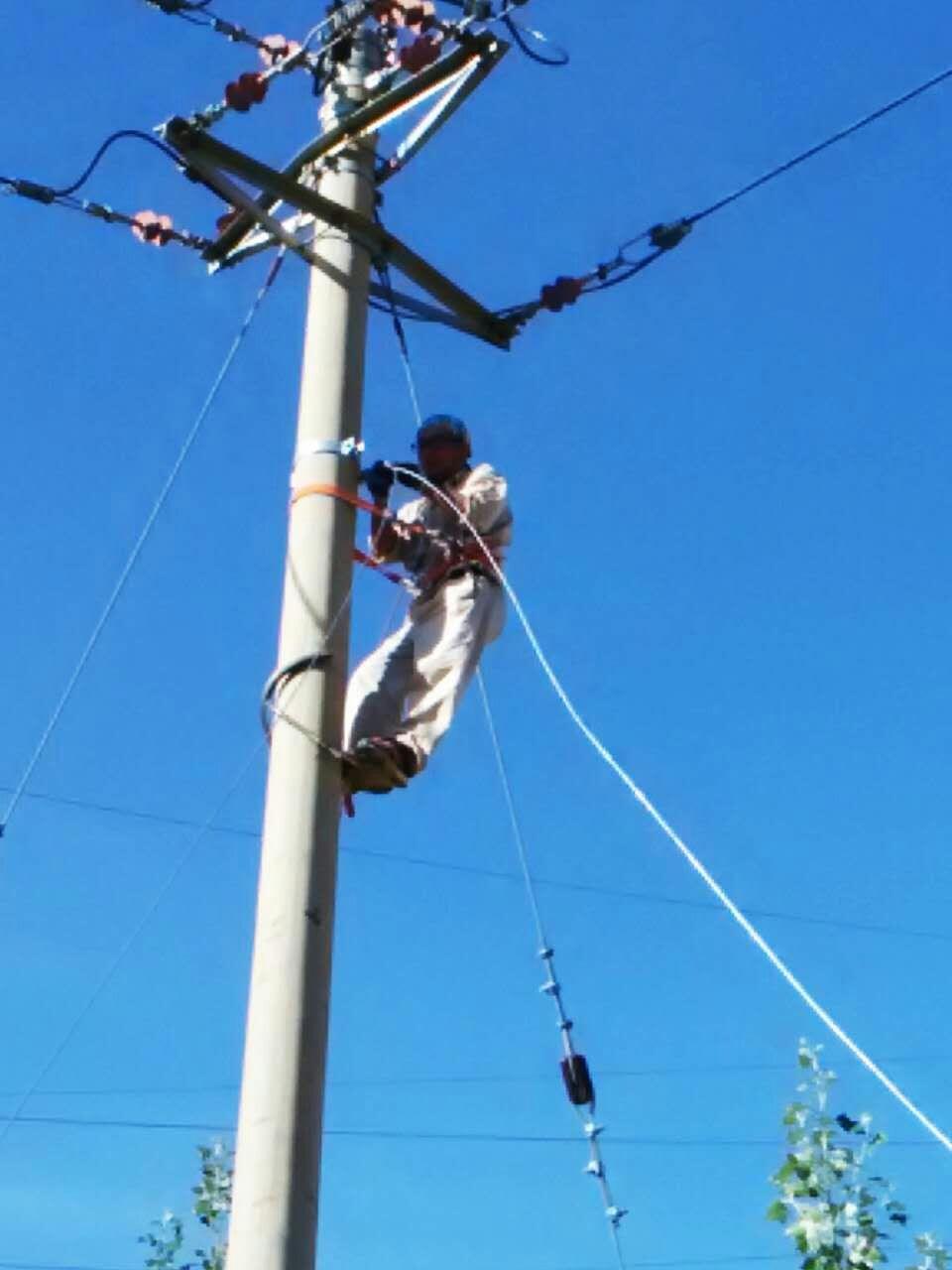 在這次工程中,最為辛苦的就是“倒桿子”了,寧愿多掛幾個夾子也不愿倒桿子,因為每倒一次都會耗費大量的體力,讓人汗流浹背、氣喘吁吁,施工人員相當于穿著一件40斤左右的鐵褲衩 在一人粗細的桿頂左右移動工作。最讓人煩惱的是當小車上的人員處于兩根電線桿之間的位子時鋼纜滑滑小車滑輪外,需要耗費極大的體力才能將它重新弄好,由于處于那時我們用力會無處生根,只能用撬棍一點一點撬,一弄就得一個小時左右,上不去下不來,那過程,真不是一般的“酸爽”!