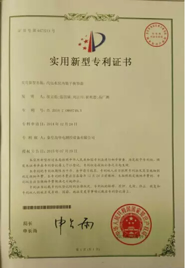 公司于2014年12月24日提交的“汽包水位內(nèi)裝平衡容器”專利獲中華人民共和國國家知識產(chǎn)權(quán)局頒發(fā)專利證書。