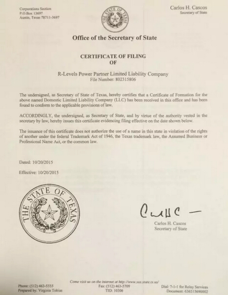 【企業(yè)要聞】喜訊:秦皇島華電測控設(shè)備有限公司美國分公司R-Levels Power Partner LLC完成注冊!