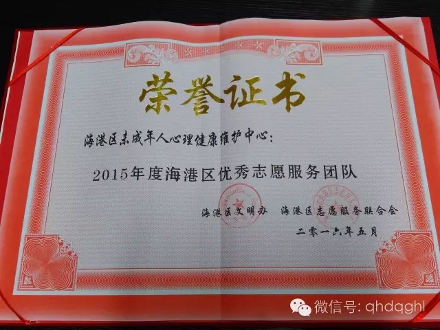 2016年5月26日上午,海港區(qū)區(qū)委區(qū)政府組織召開了海港區(qū)志愿服務(wù)工作推進(jìn)會(huì)。會(huì)上對(duì)2015年度海港區(qū)優(yōu)秀志愿者及志愿者團(tuán)隊(duì)進(jìn)行了表彰,海港區(qū)未成年人心理健康維護(hù)中心暨秦皇島市市民情感護(hù)理中心喜獲2015年度海港區(qū)優(yōu)秀志愿者團(tuán)隊(duì)獎(jiǎng)。