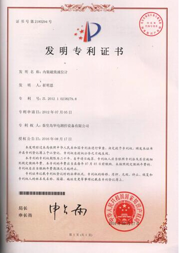 【企業(yè)要聞】喜訊:公司申請(qǐng)的“內(nèi)裝磁致液位計(jì)”獲頒發(fā)明專利證書(shū)