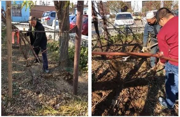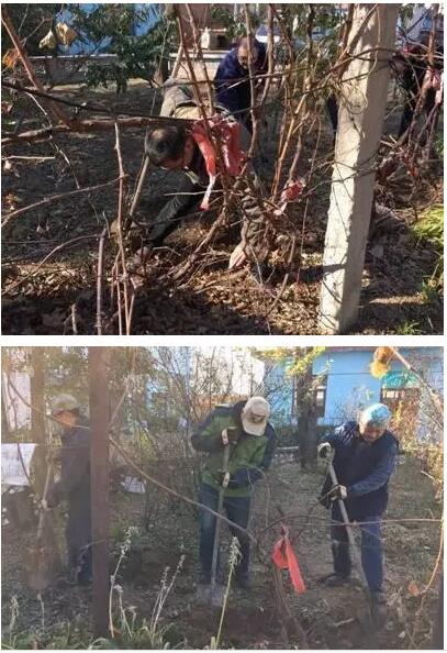 午餐過后,黨員和入黨積極分子們紛紛來到公司果園,積極參與為果園葡萄秧埋土防寒的活動中。在黨支部組織委員張勇清的帶領(lǐng)下,大家將修剪后的葡萄秧順其生長方向捆綁好,再用鐵鍬掘溝、挖好水渠。池塘中的水是最好的天然肥料,大家將池塘水引流至水渠,這樣既充分利用了水資源,又為葡萄秧添加了養(yǎng)分。本次黨員活動在歡快的氣氛中結(jié)束。