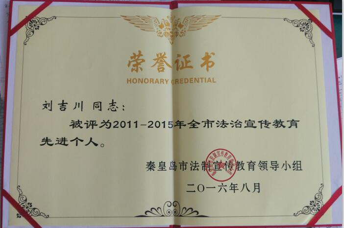 喜訊:秦皇島華電測控設(shè)備有限公司總經(jīng)理劉吉川先生被評為“2011-2015年全市法治宣傳教育先進個人”,劉吉川先生作為首個私營企業(yè)家被評選上“先進個人”。