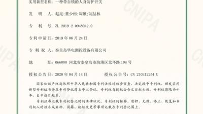【企業(yè)要聞】公司申請的“一種帶自鎖的人身防護開關(guān)”獲頒專利證書” 2020-04-26公司于2019年6月24日提交的“一種帶自鎖的人身防護開關(guān)”(專利號:201920948942.0)專利,由中華人民共和國國家知識產(chǎn)權(quán)局頒發(fā)實用新型專利證書。此項專利的授權(quán),標志著公司已經(jīng)擁有49項自主知識產(chǎn)權(quán)。一種帶自鎖的人身防More